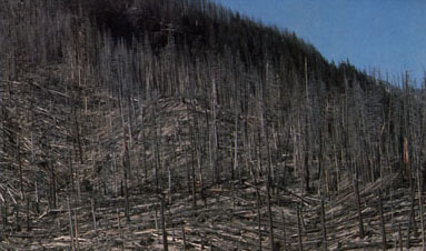 Border area of the lateral-blast zone. Dead trees of the "seared zone" (middle ground) stand between the flatteded